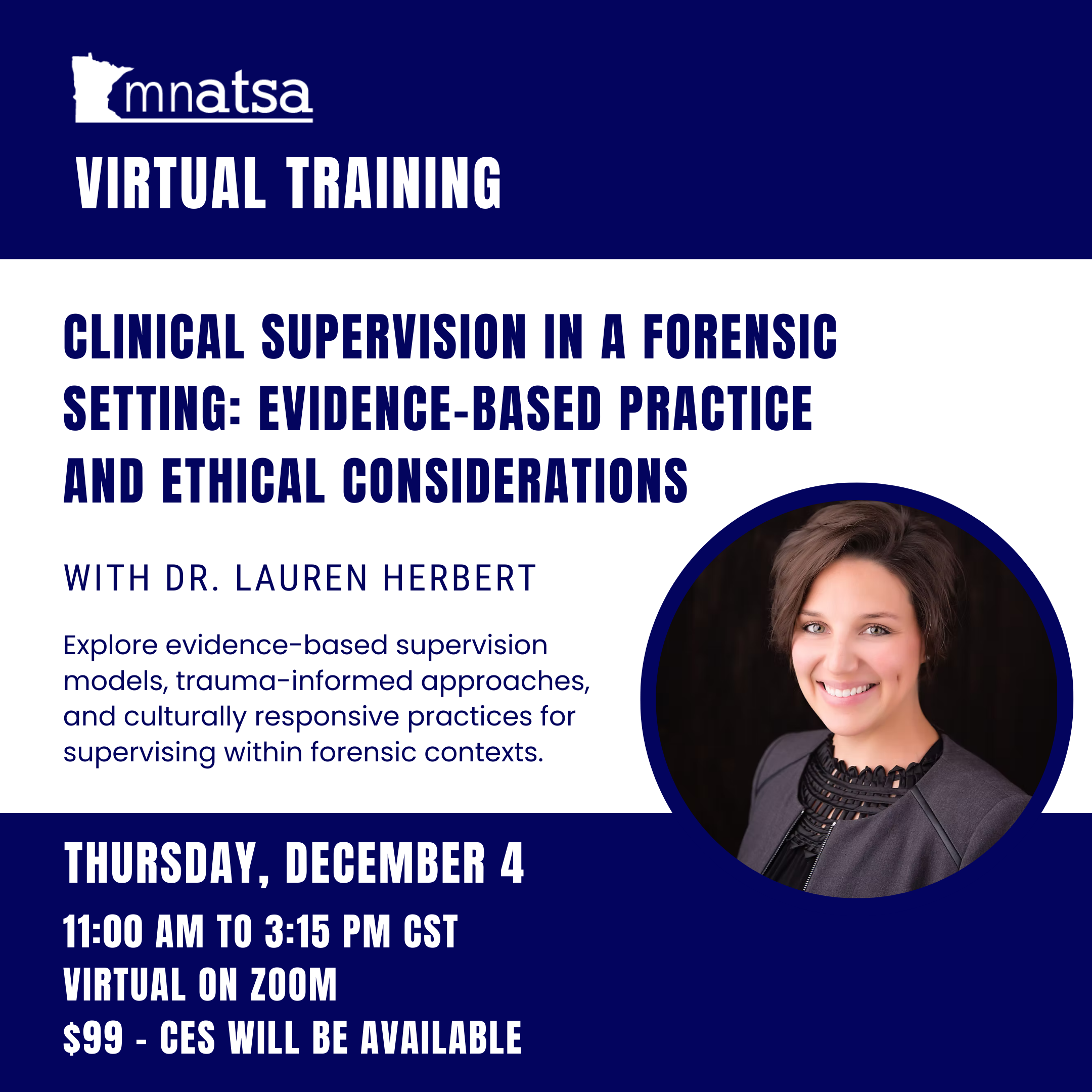 Participants will explore evidence-based supervision models, trauma-informed approaches, and culturally responsive practices for supervising within forensic contexts. Through a combination of instruction, case examples, and interactive discussion, participants will: